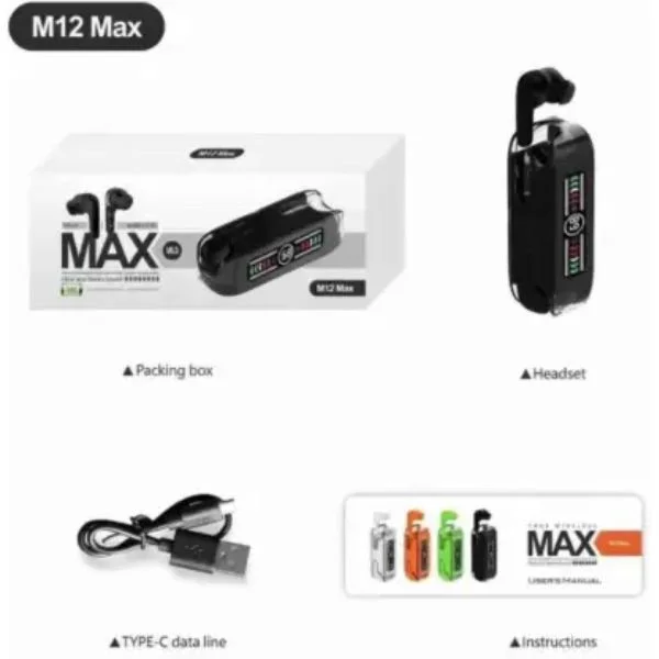 - The M12 Max Compact Earbuds are designed for a superior audio experience with advanced features that cater to both casual listeners and avid gamers. These true wireless earbuds come in an elegant black finish and offer the latest Bluetooth 5.3 technology, ensuring a stable and fast connection. The 9D stereo sound provides immersive audio quality with deep bass and crystal-clear highs, making them perfect for music lovers.One of the standout features of the M12 Max is its low latency mode, which significantly reduces audio lag, making it ideal for gaming and video streaming. This ensures that the audio syncs perfectly with the visuals, providing an enhanced gaming experience. The earbuds are ergonomically designed for a comfortable fit, ensuring they stay in place during intense activities.